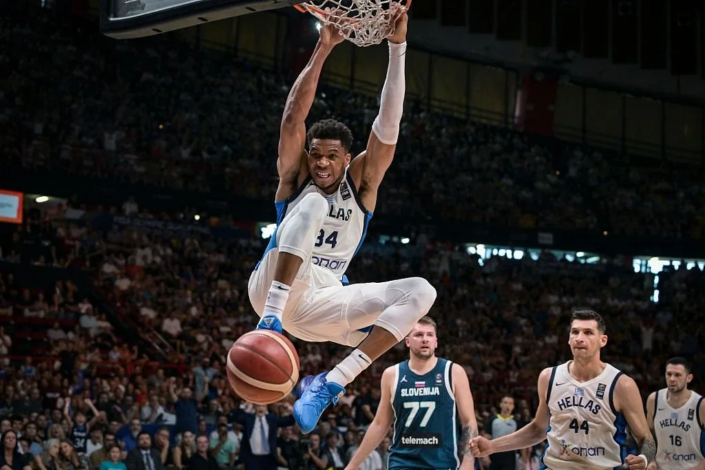 Giannis takes flight in Piraeus, punctuating Greece’s dramatic qualifier win over Luka Dončić’s Slovenia.
