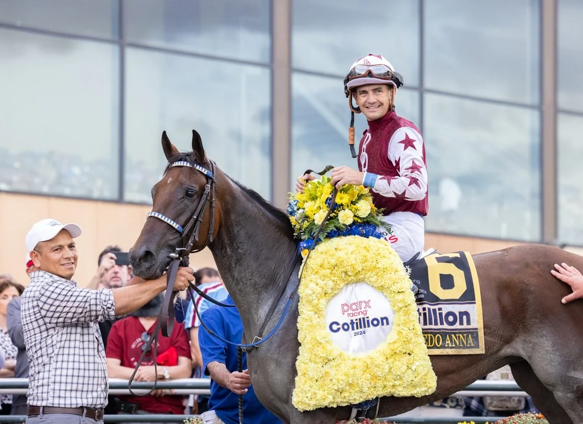 Thorpedo Anna and Brian Hernandez Jr. in the Cotillion winner’s circle.